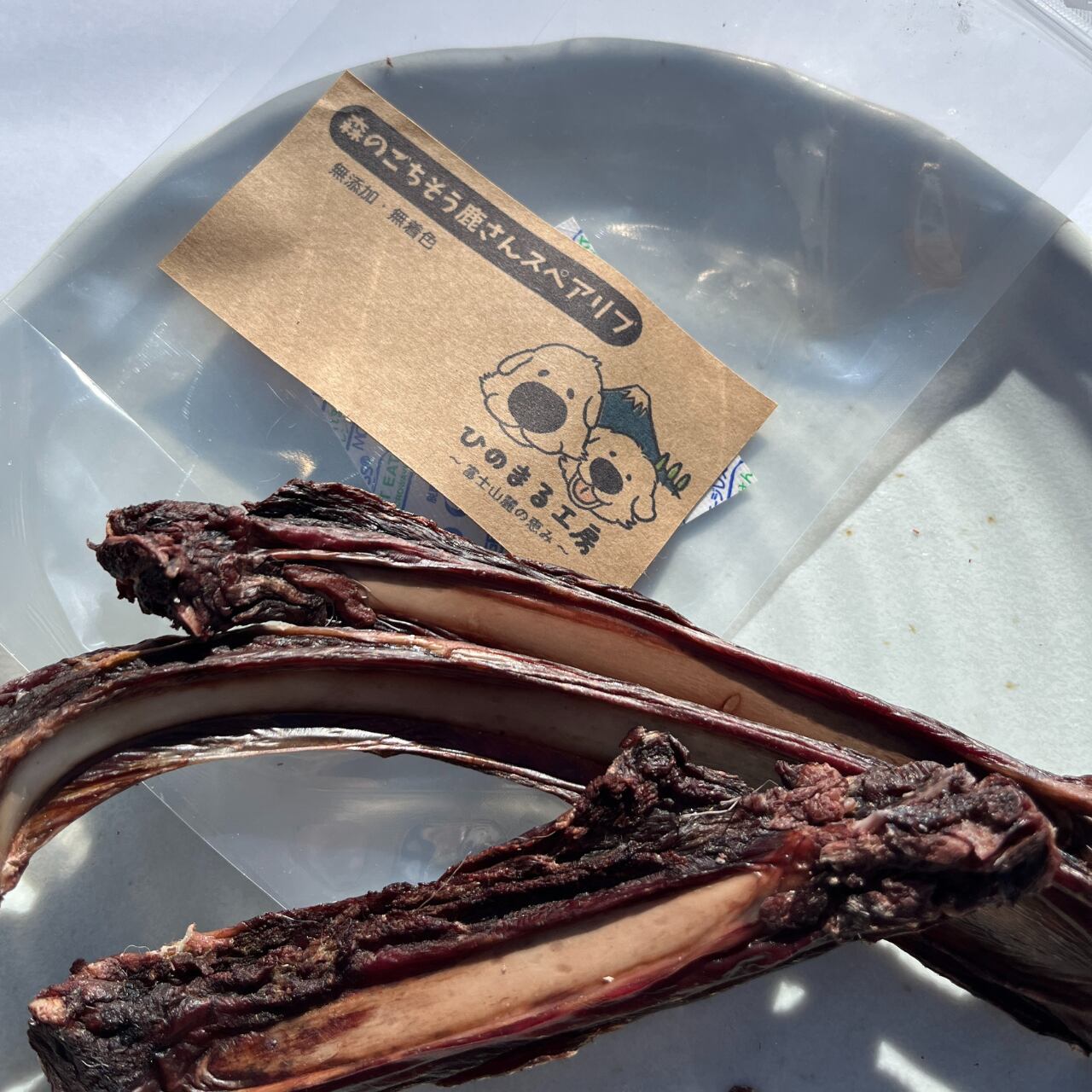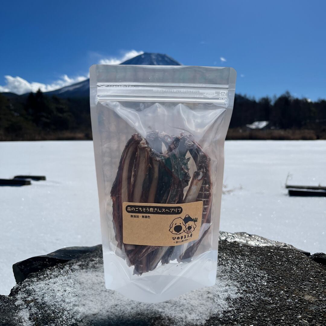 「森のごちそう 鹿さんスペアリブ」は、富士河口湖町産の野生ニホンジカのスペアリブをじっくり乾燥させた、噛み応え抜群のごちそうです。